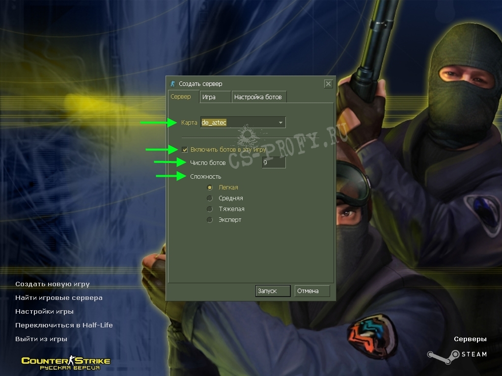 В появившемся диалоговом окне выбираем карту, и ботов (если необходимо). В дальнейшем ботов можно будет добавить или убрать. (рис. 2)