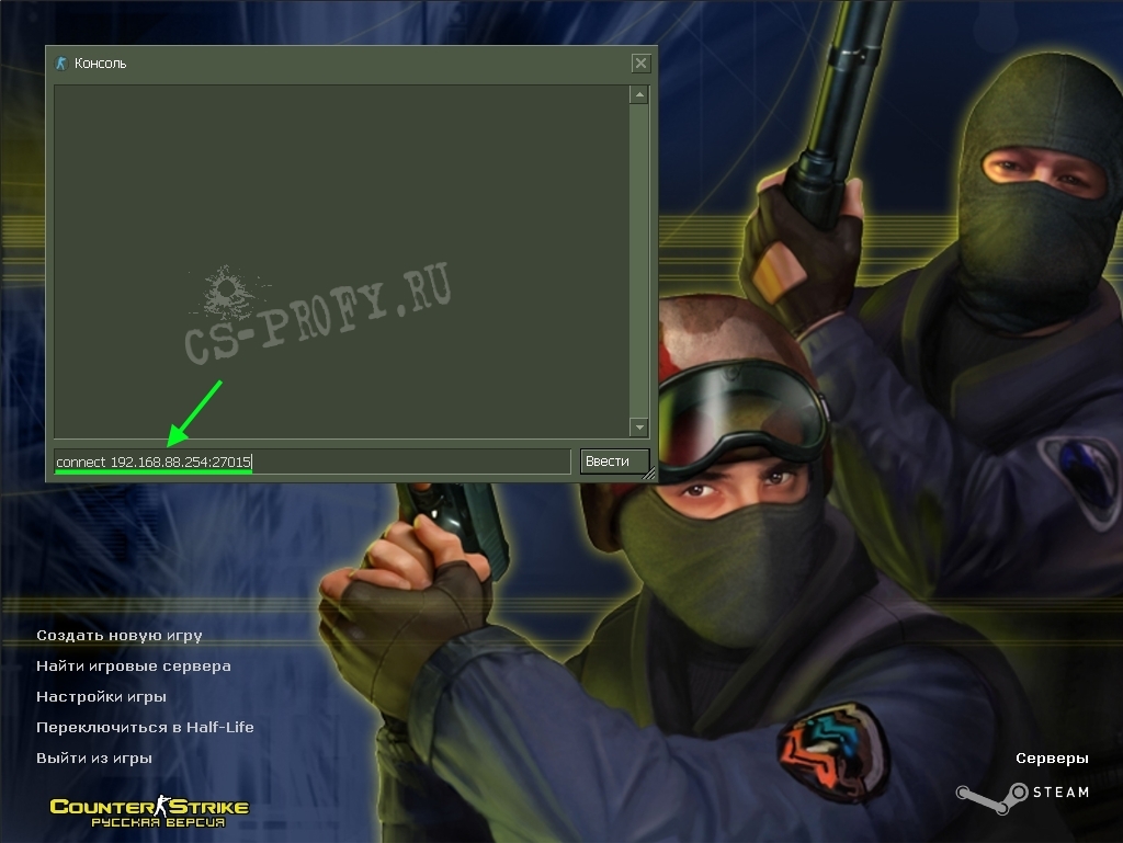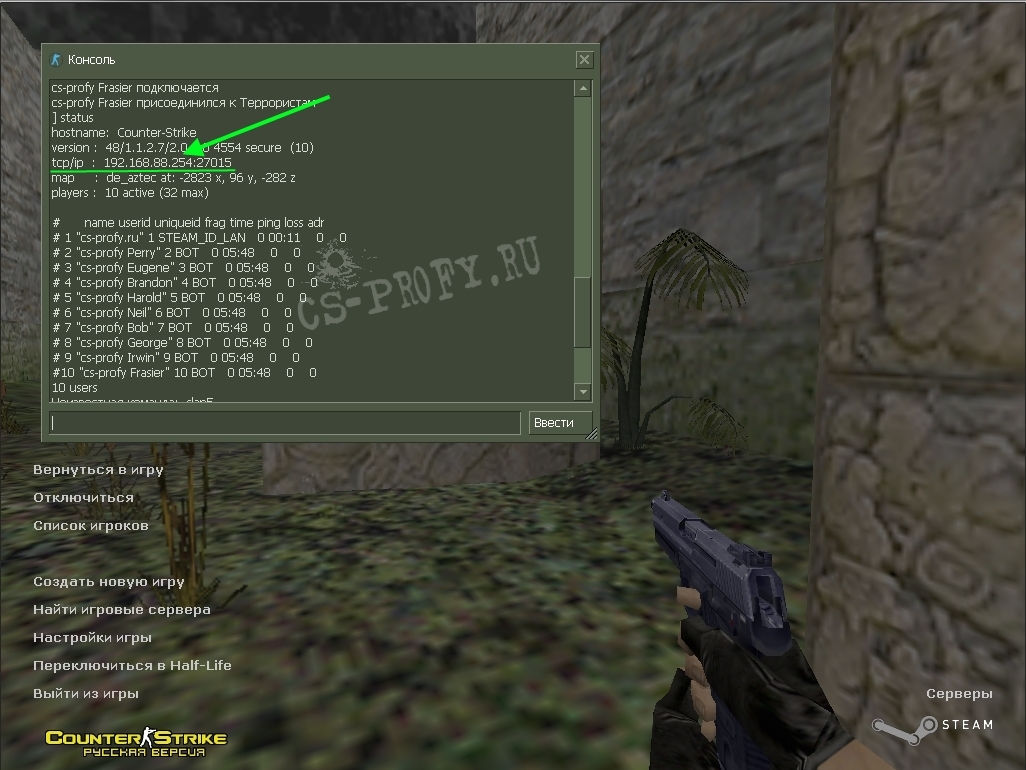 Даем его тому человеку, который хочет подключиться к вашему серверу. Только не в том виде в котором он представлен в самой коммандной строке, а добавив порт сервера. Порт сервера обычно имеет значение 27015. В нашем случае конечный вид адреса выглядит так: 192.168.88.254:27015 Для того чтоб человек попал на сервер, ему нужно в консоле игры написать команду connect и адрес сервера. В нашем случае это так: connect 192.168.88.254:27015 (рис. 9)