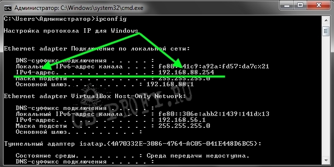 Находим нужное нам, а именно строку IPv4-адрес. Напротив него будет ваш локальный IP адрес, он то нам и нужен. В моем случае это 192.168.88.254 (рис. 8)